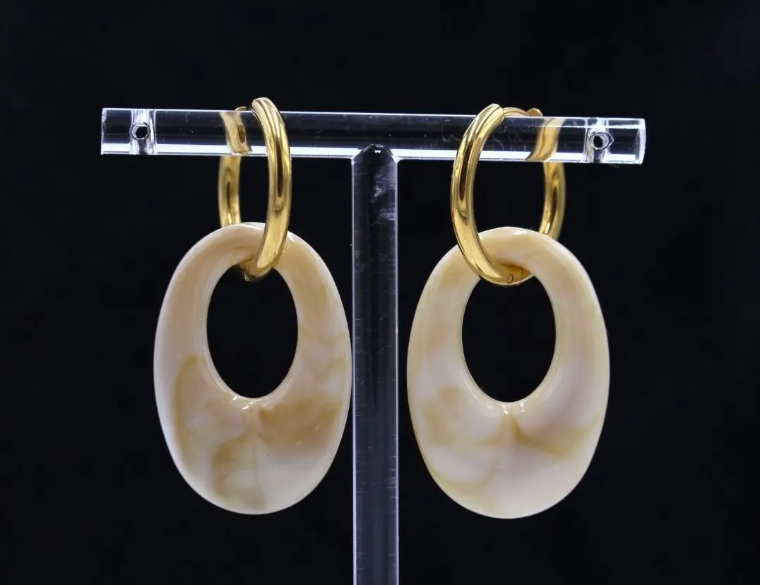 Pendientes con aro de acero inoxidable y gota de resina de alta calidad de color dorado. Dimensiones: aro de 20x2 mm. Colgante de 4,5 cm. Peso 45,36 g.