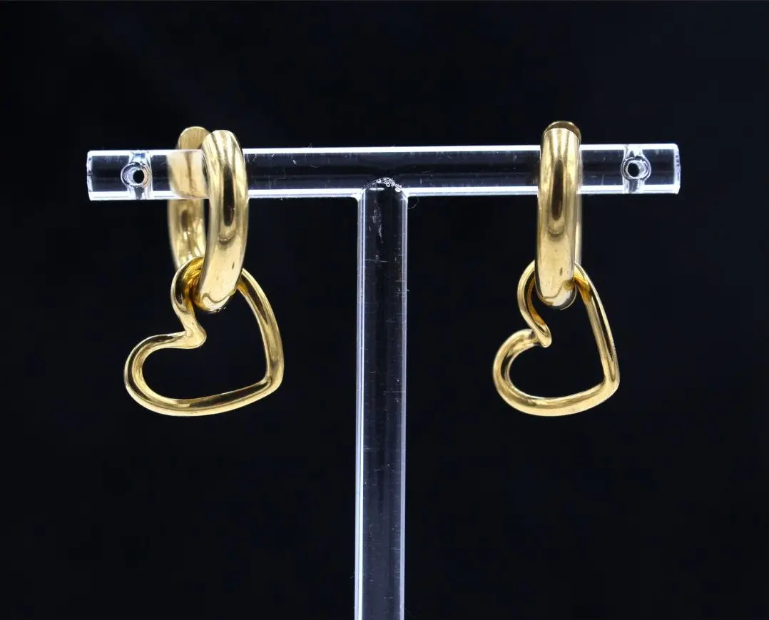 Pendientes de acero inoxidable con corazón abierto. Dimensiones aro 16x4 mm y colgante en forma de corazón abierto de 16 mm. Peso 45,36 g. No se decolora.